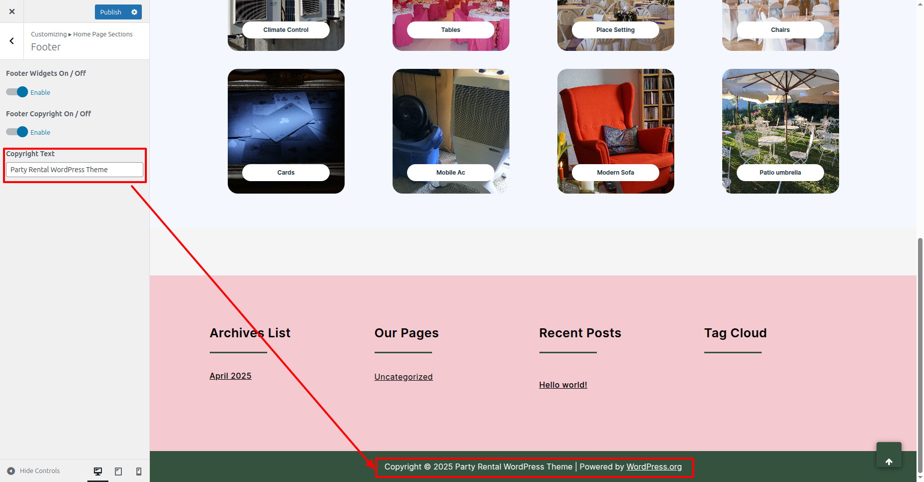 3. In the dashboard, visit Appearance -- Customize -- Home Page Sections -- Footer