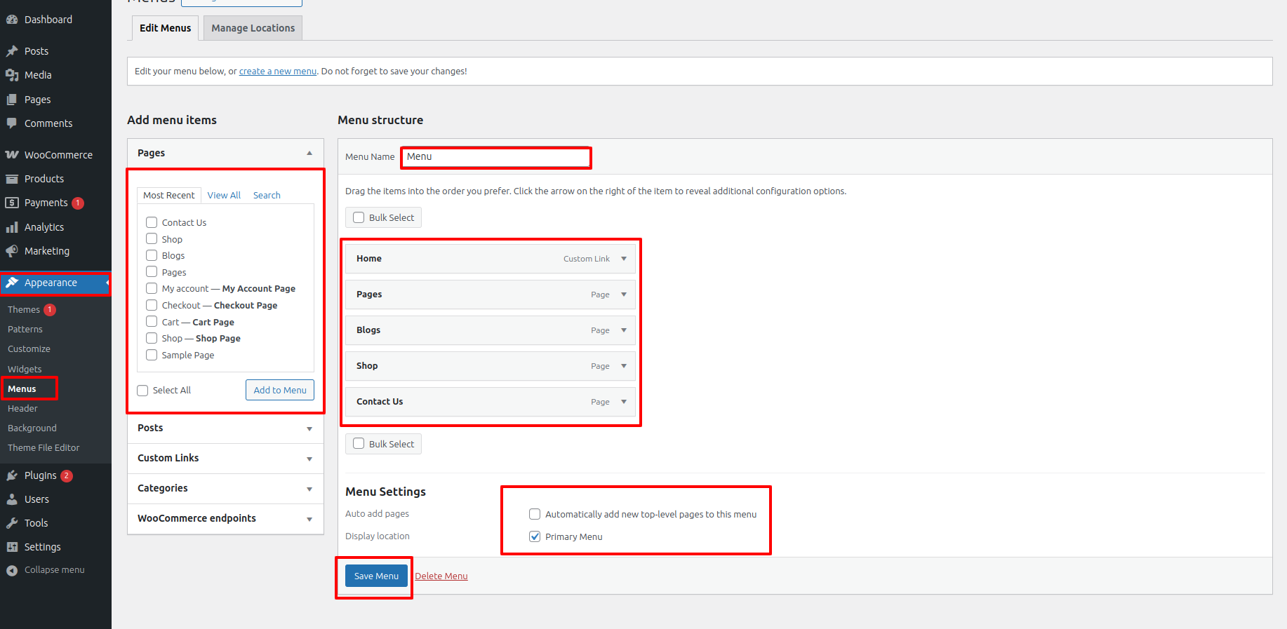 To create a new menu, follow these steps:At the top of the page, select "Create a new menu".Enter a name for your new menu in the "Menu Name" box.Click on the "Create Menu" button.