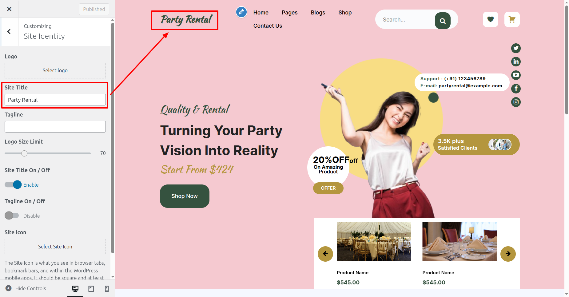 Proceed with Theme Logo setup, you can set site title and tagline, proceed as described below.