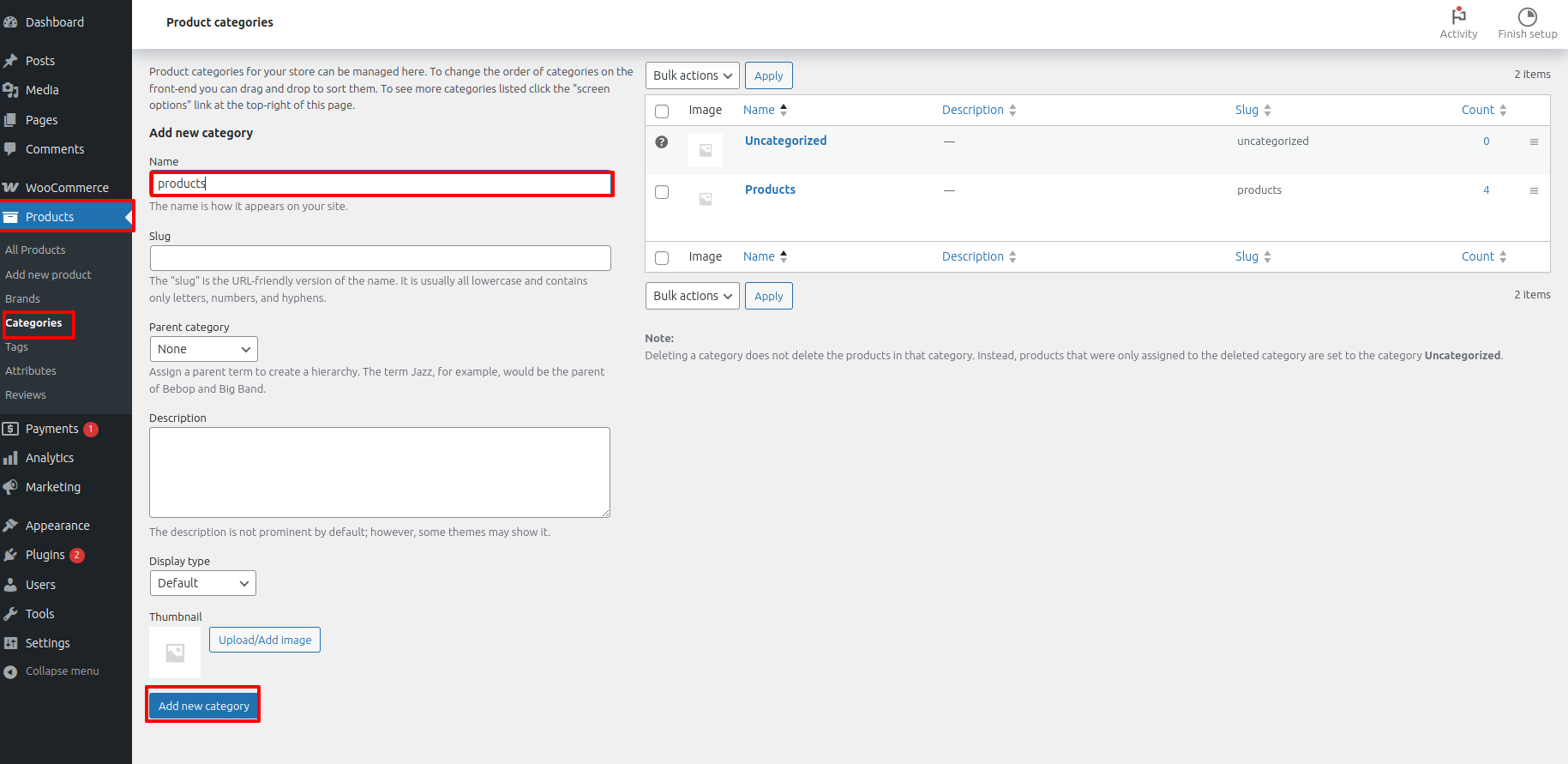 This screen is divided into 2 sections, the Add New Category and category table sections.