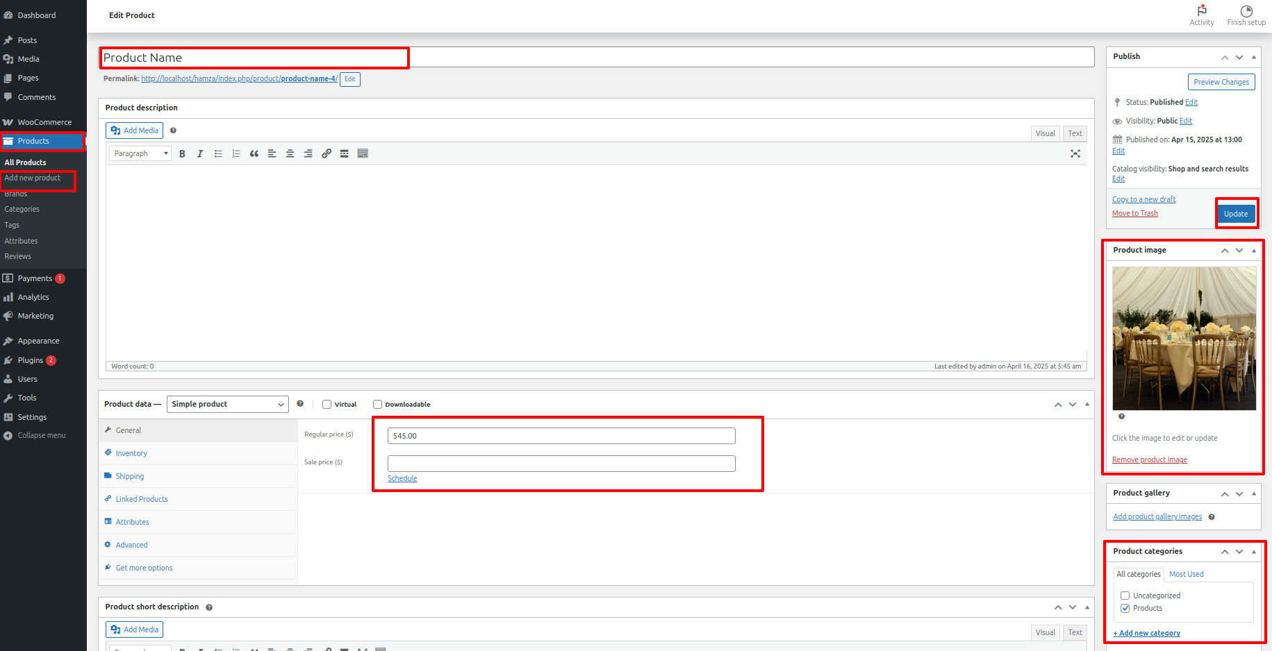 In order to proceed with Products Settings, You can set product titel, product description, price and image. And select which category you want this product to show.