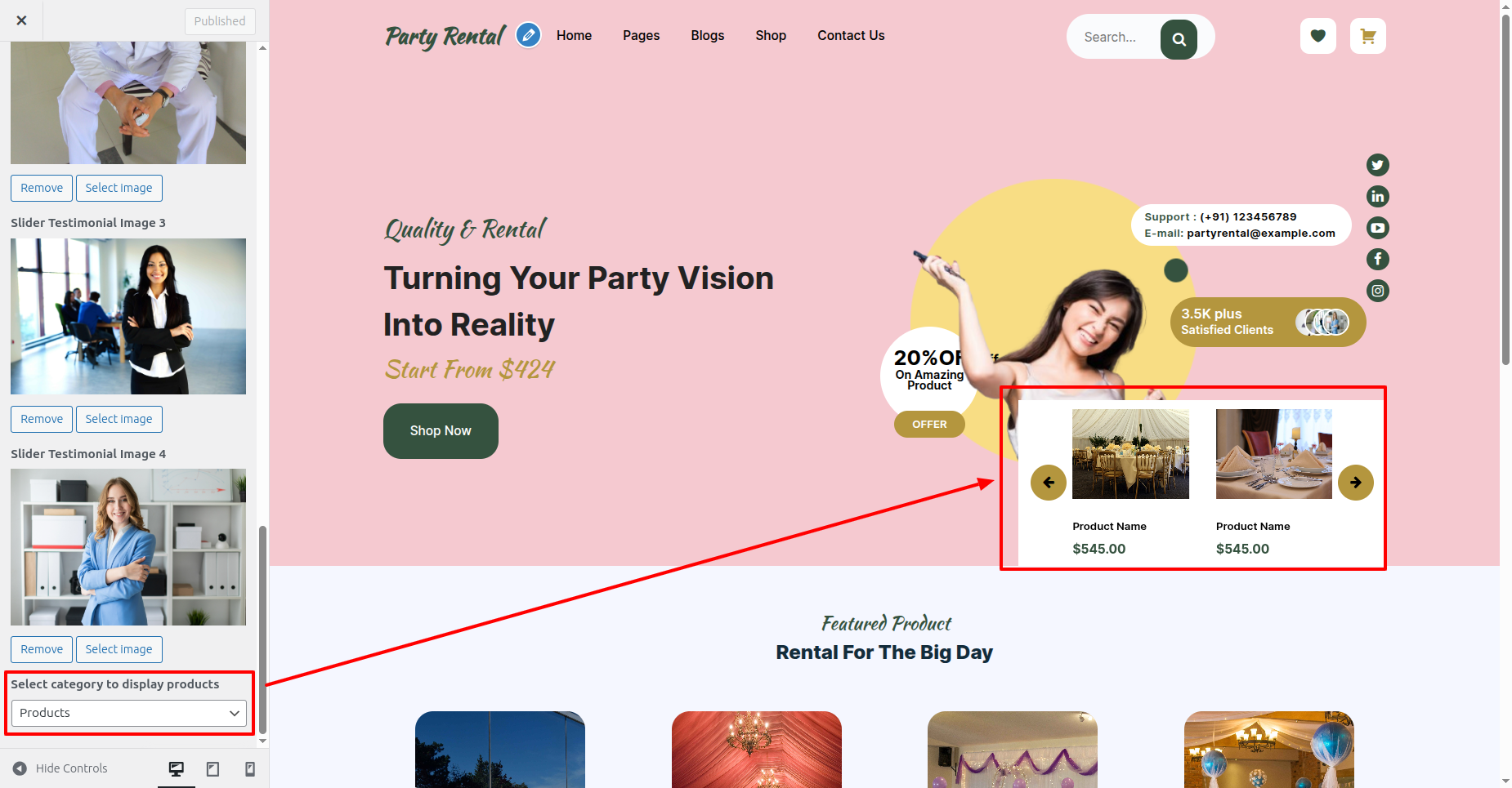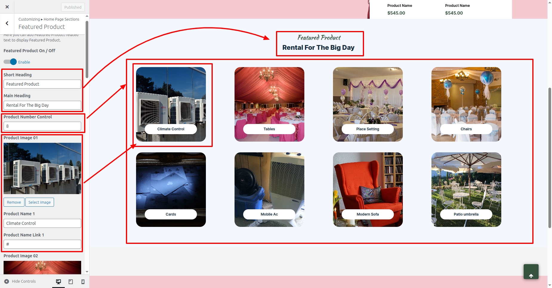 In the dashboard, visit Appearance -- Customize -- Home Page Sections -- Featured Product
