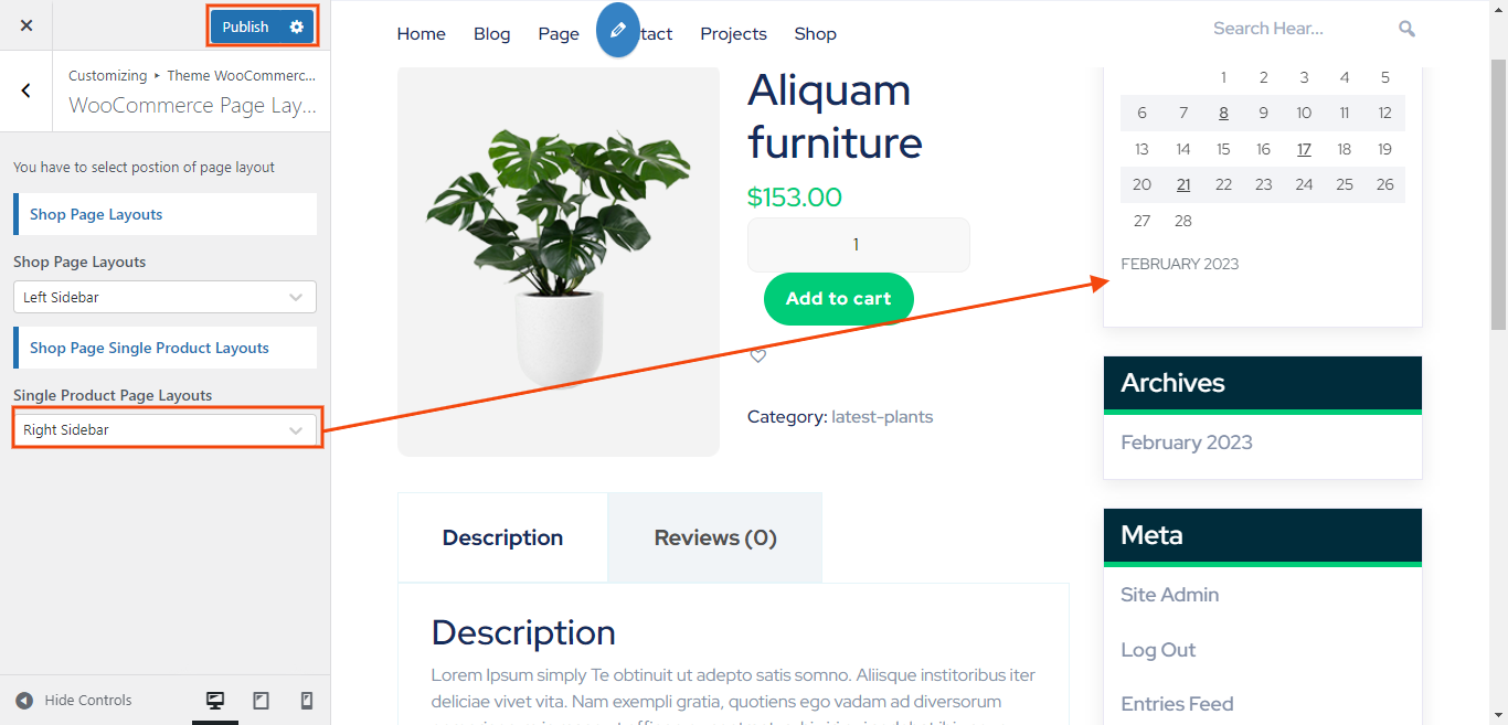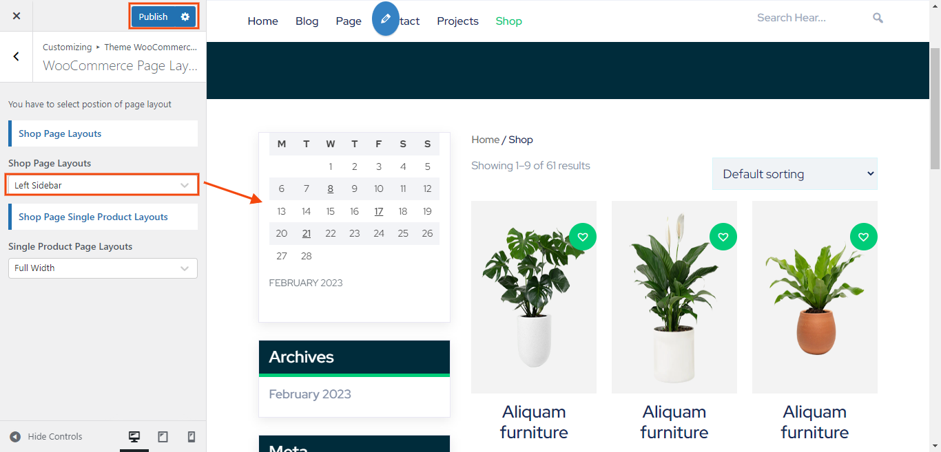 In the Dashboard, go to Appearance >> Customize >> Theme WooCommerce Settings >> WooCommerce Page Layout