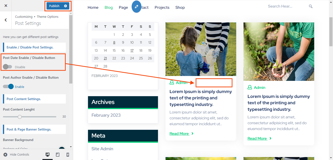You can Enable / Disable post of admin, comments and date. You can choose from this options for each Post Settings.