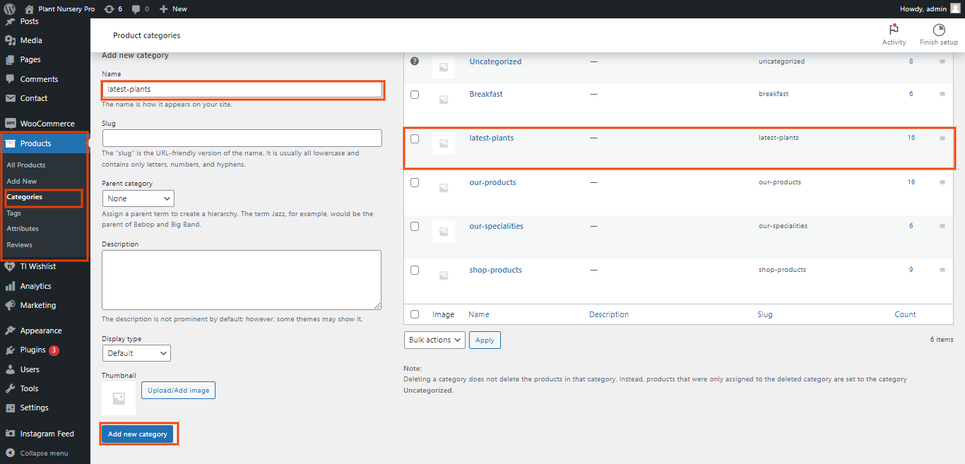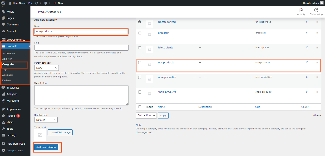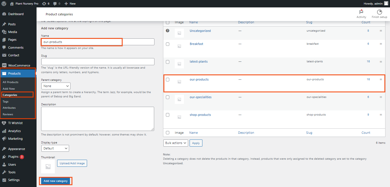 In the Dashboard, go to Products >> Categories >> Add New