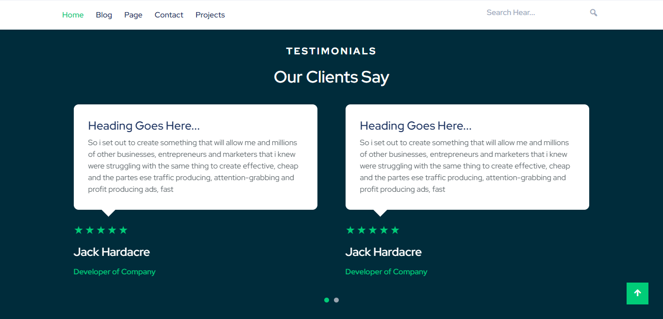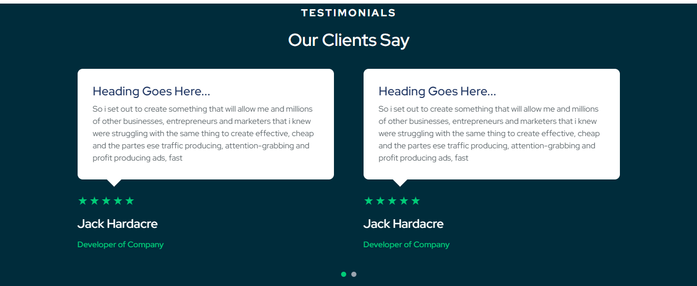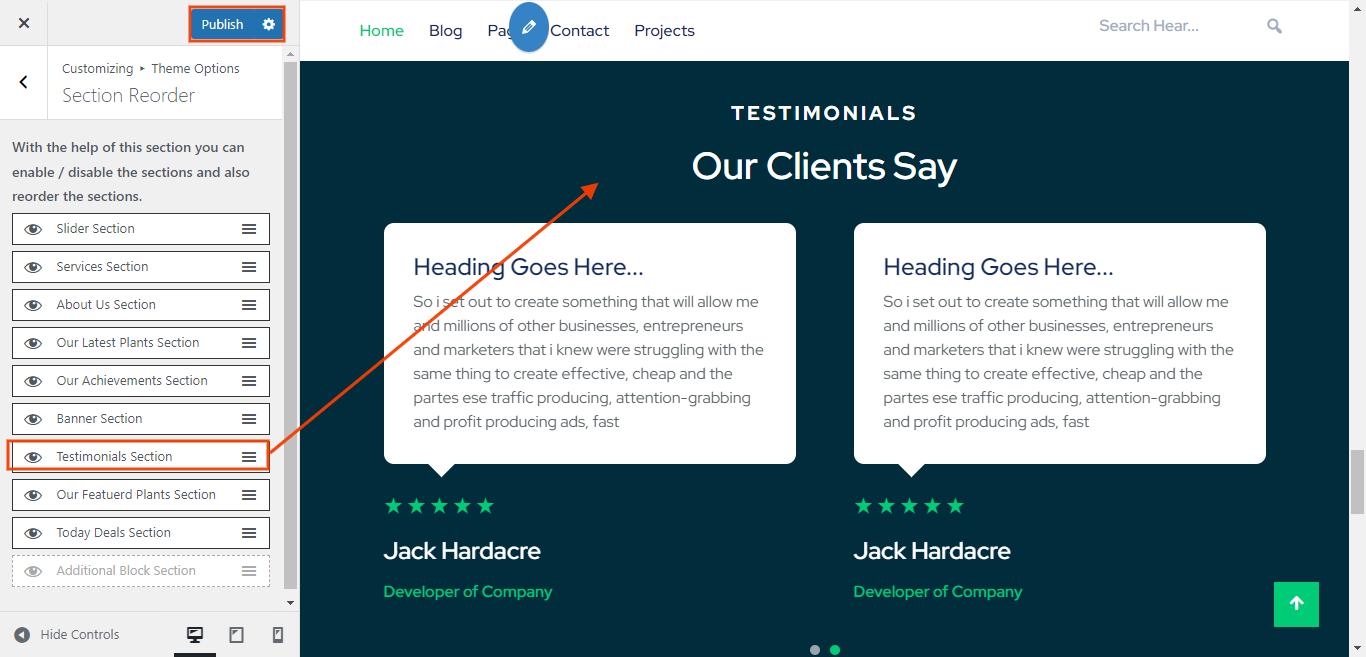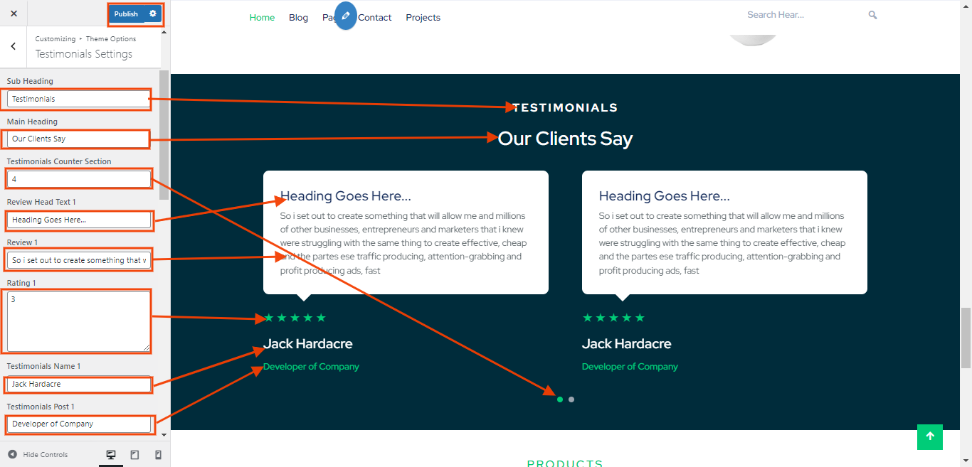 You can set sub heading, main heading and text for section. You can also set the image , review, and name, post for each testimonial settings