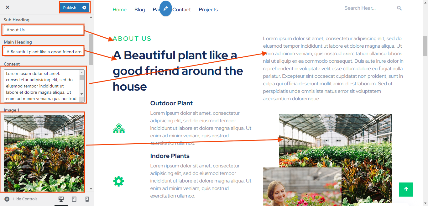 You can set sub heading, main heading , content and image section for each About Us settings