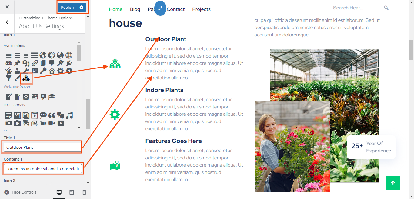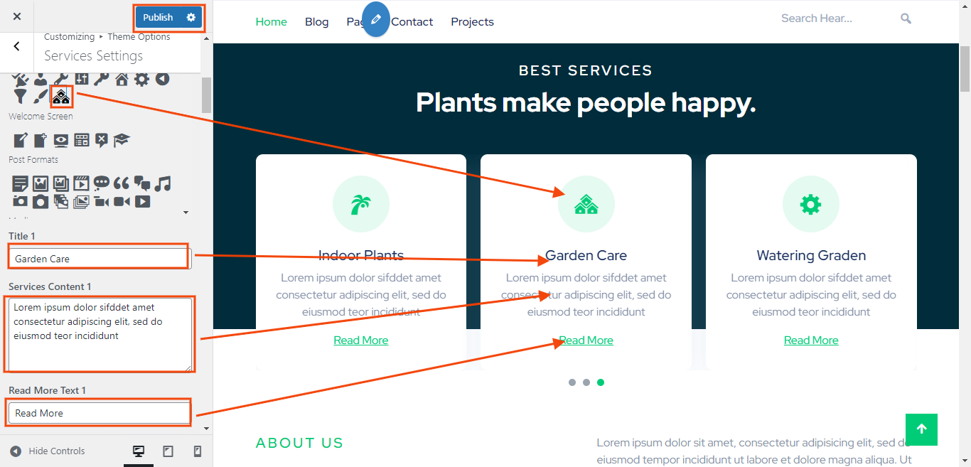You can set the icon , title , content for each About Us settings