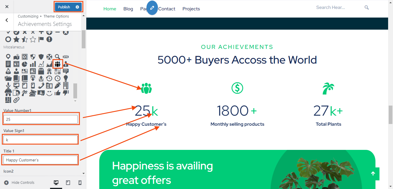 You can set icon, value number,value sign and Title of section. You can choose from this options for each Achievements settings.