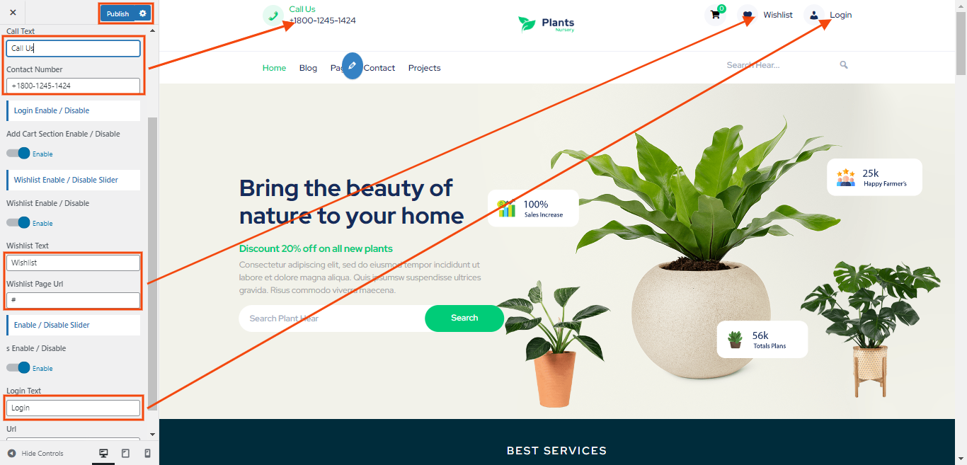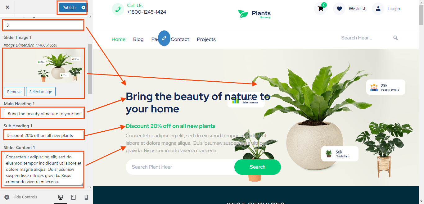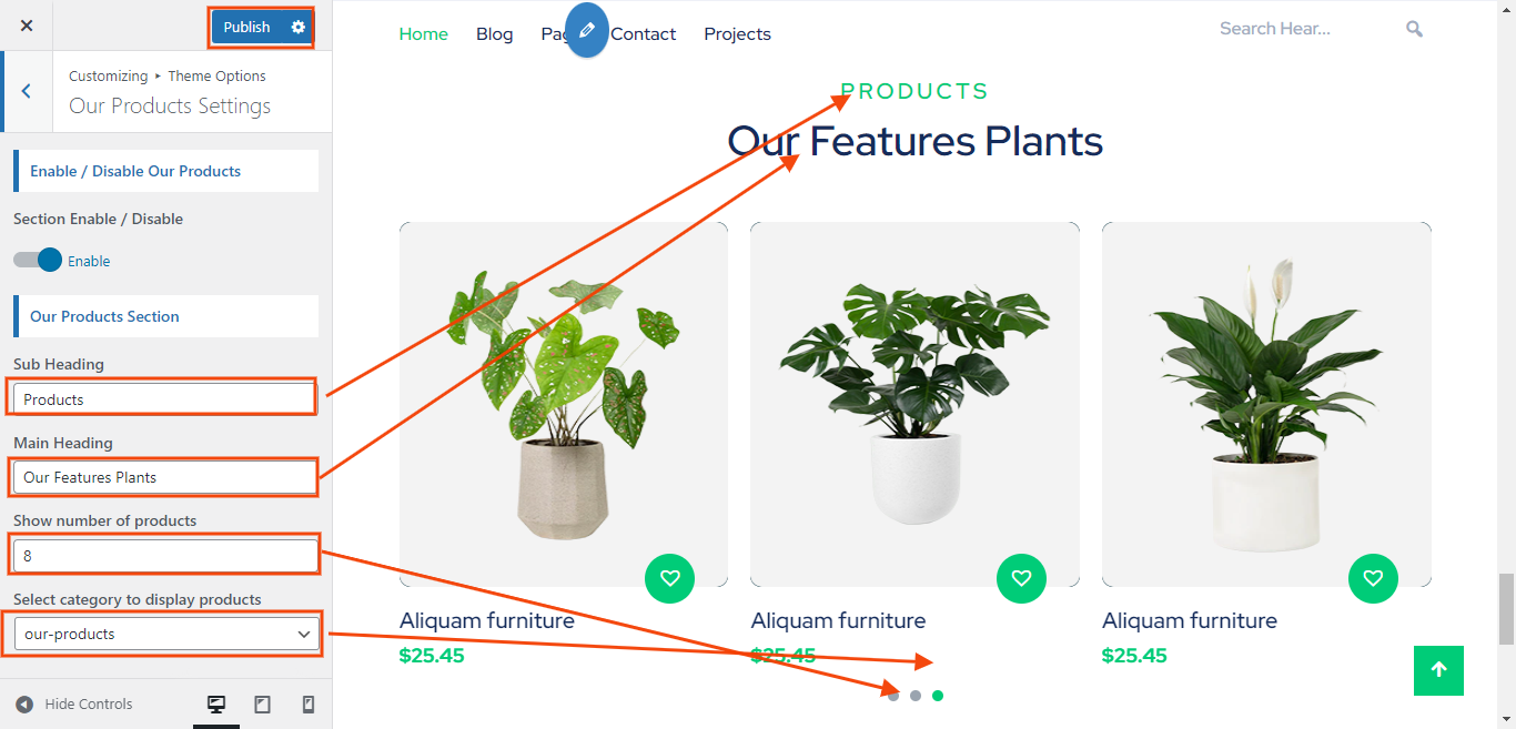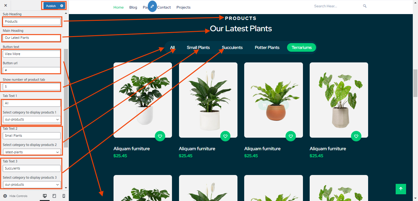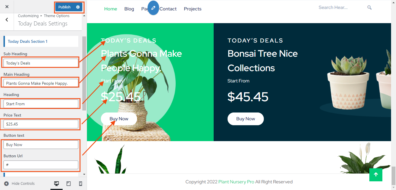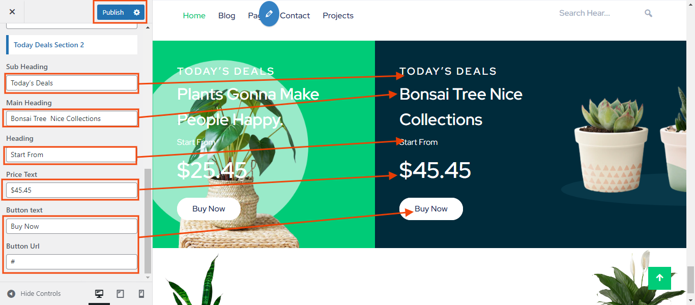 You can set heading and sub heading for section. You can choose from this options for each Latest Plants settings.
