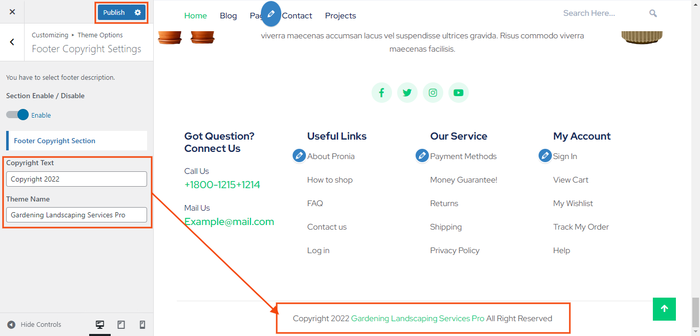In order to proceed with footer Settings, You can also set footer logo , card image and card url. You can fill the copyright content to footer copyright Settings.