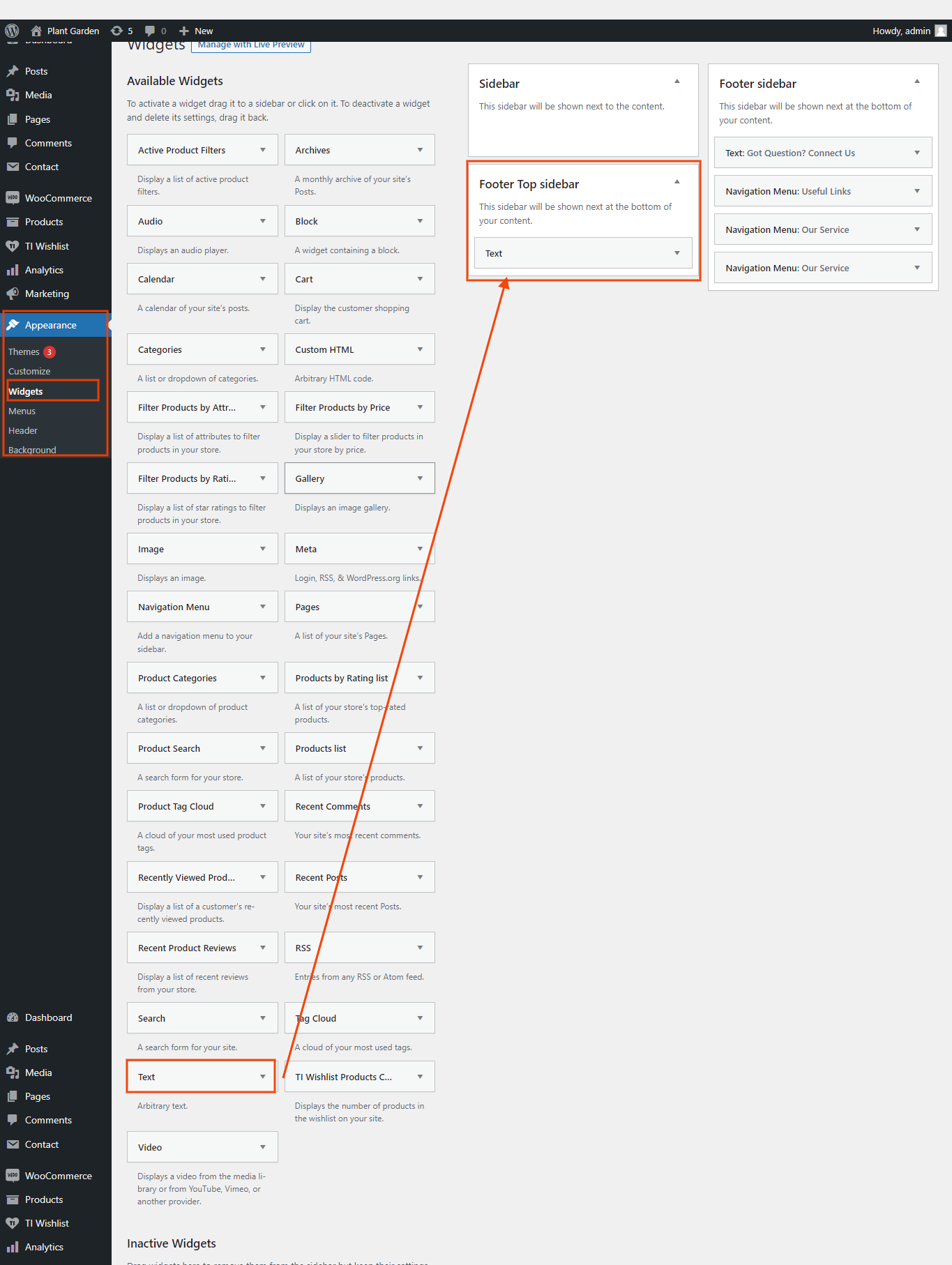 2. In the Dashboard, go to Appearance >> Widgets >> Footer Top Sidebar