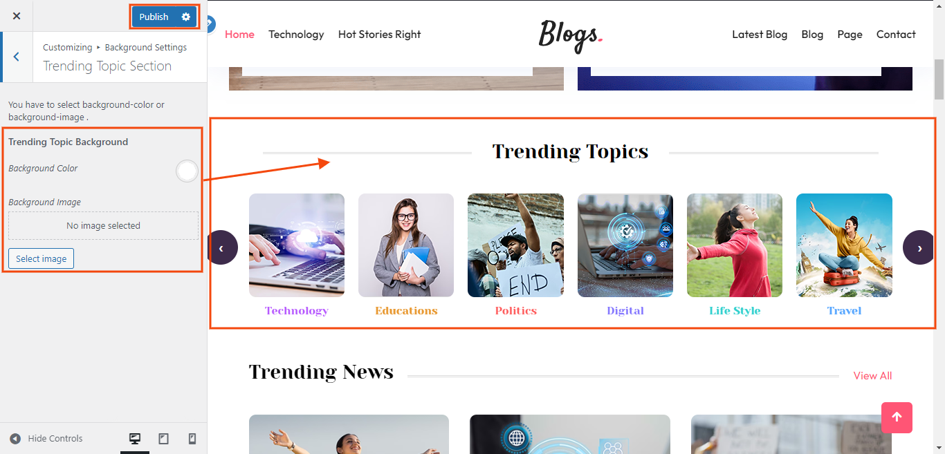 In the Dashboard, go to Appearance >> Customize >> Theme Options >> Background Settings >> Trending Topic Section