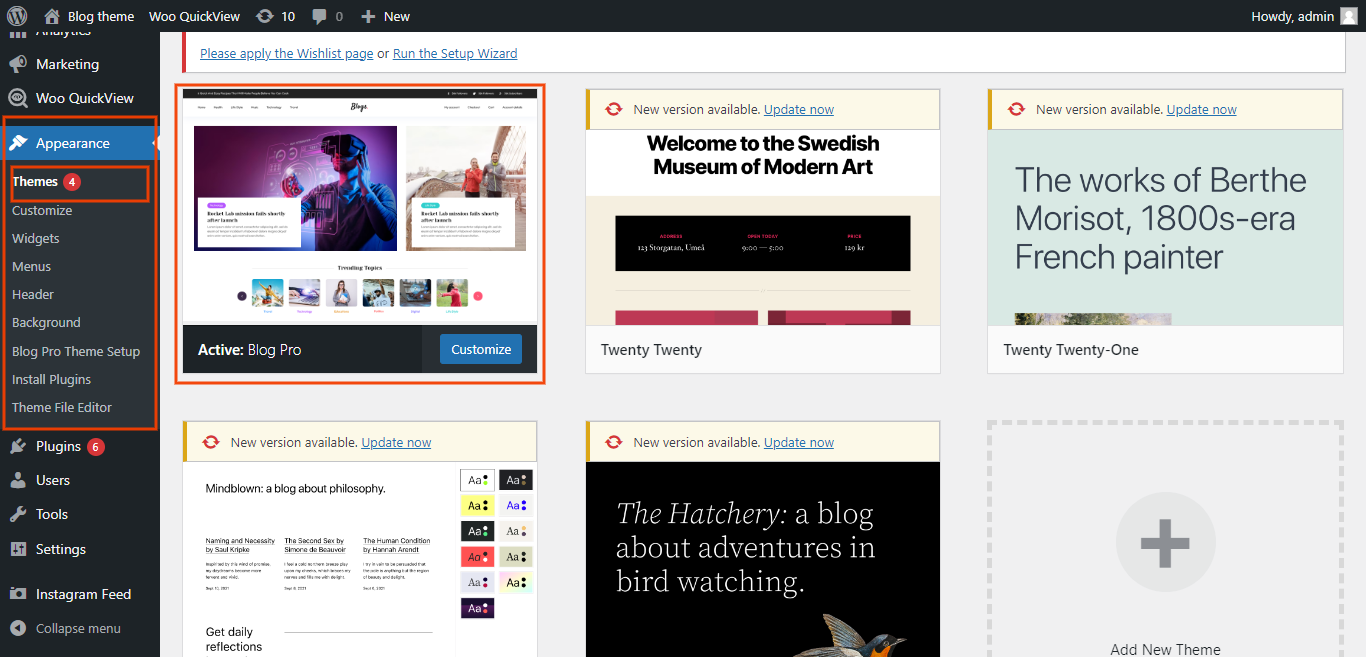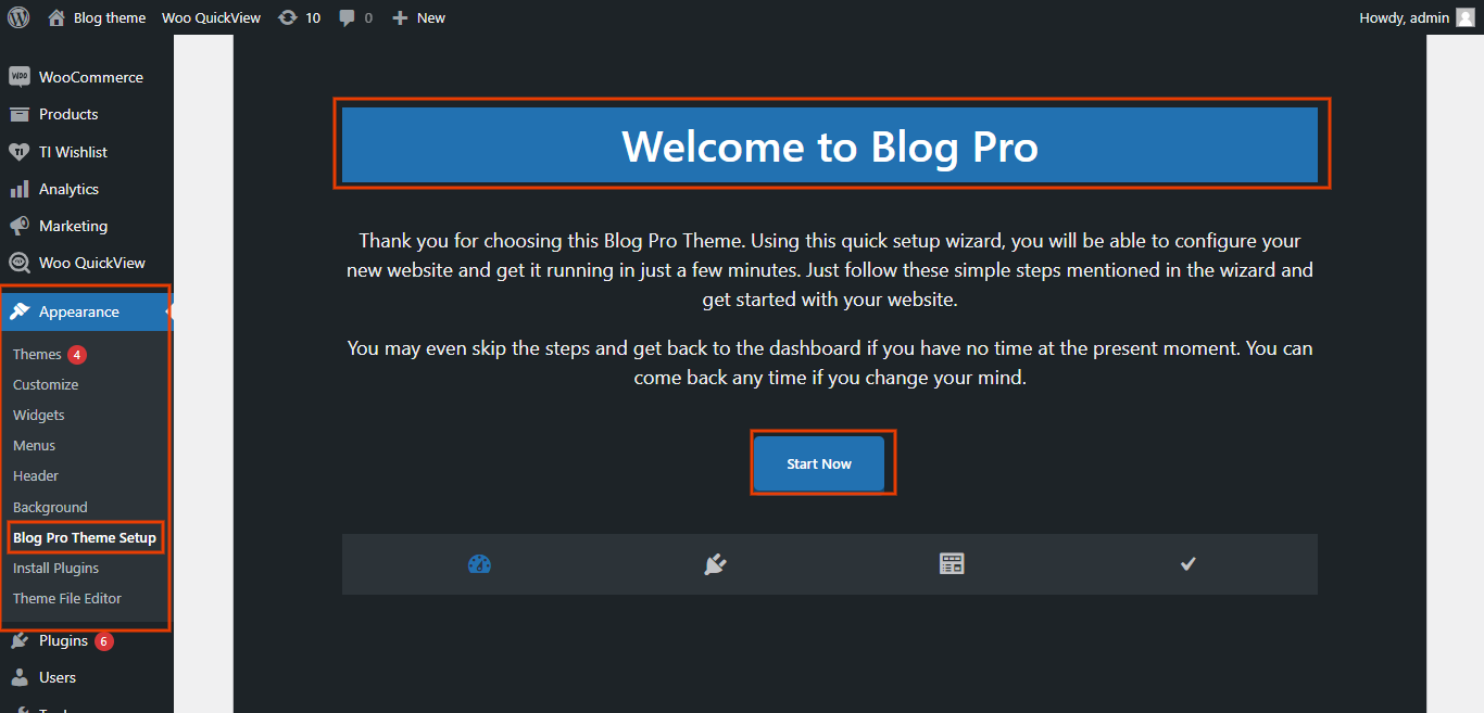 In the Dashboard, go to Appearance >> Professional Blogger Pro Themes Setup