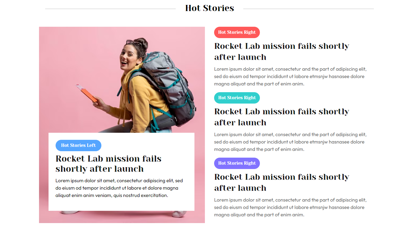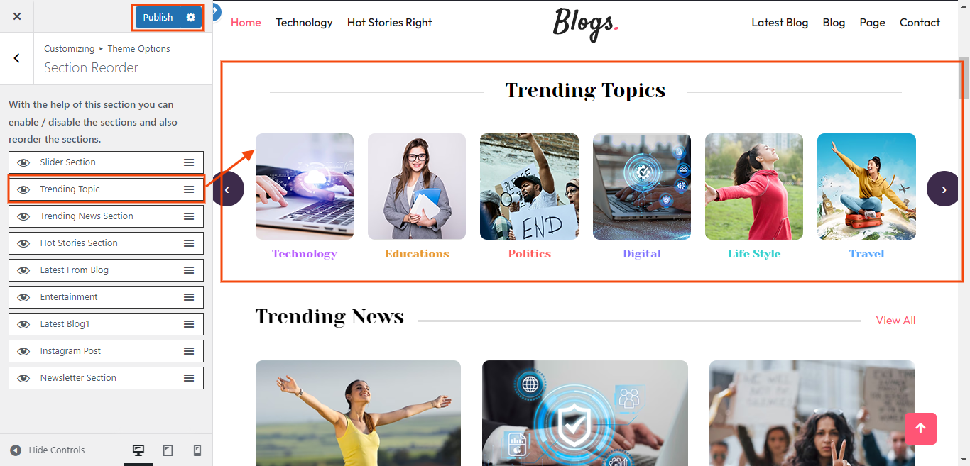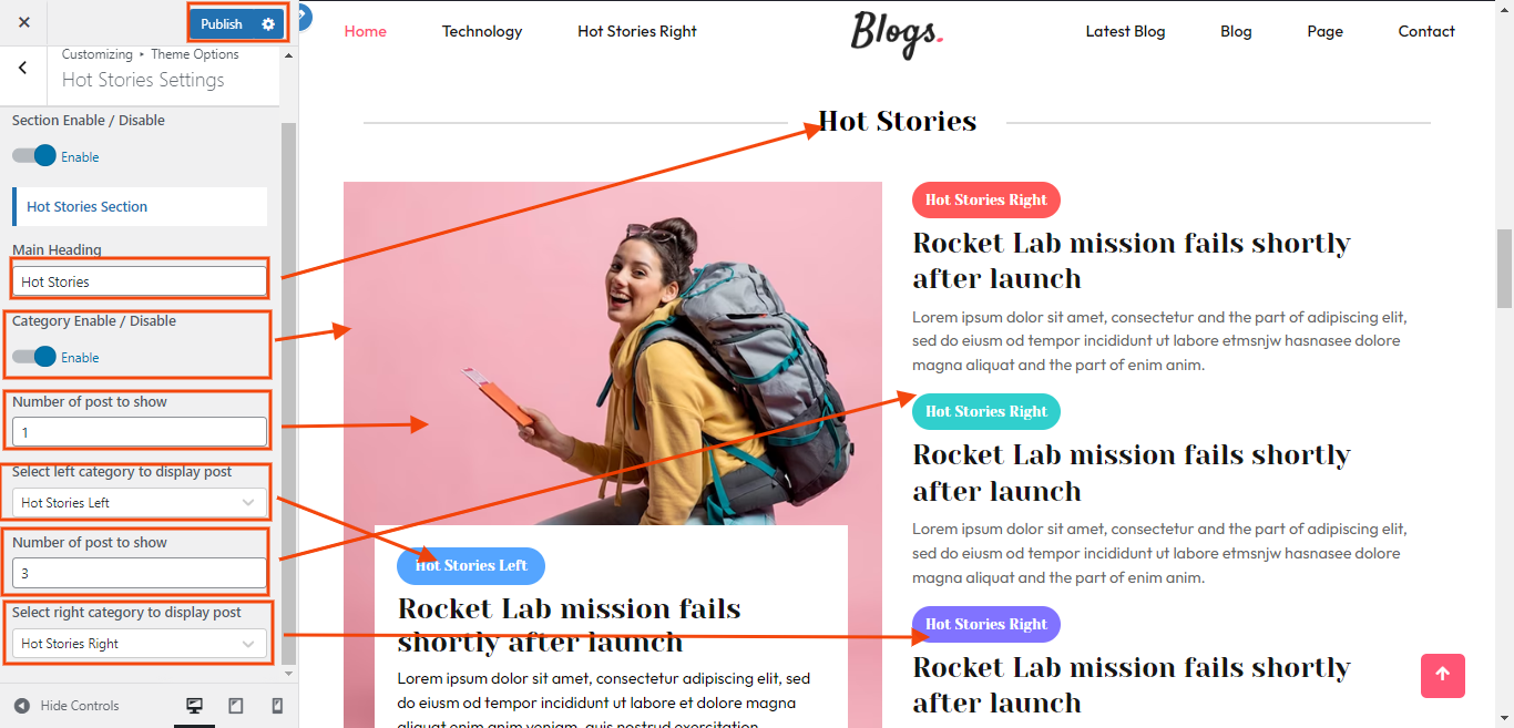 You can set heading and content of section. You can choose from this options in Hot Stories settings.