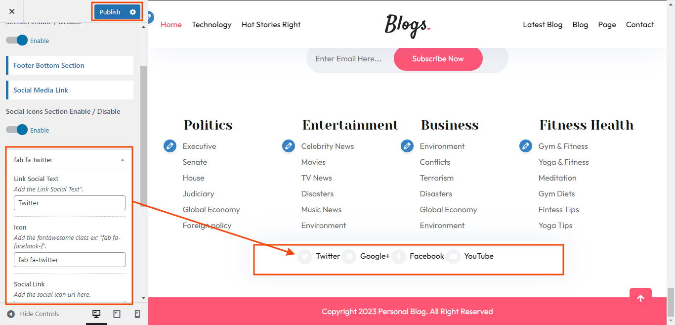 In order to proceed with footer bottom Settings, You can also set social icon.