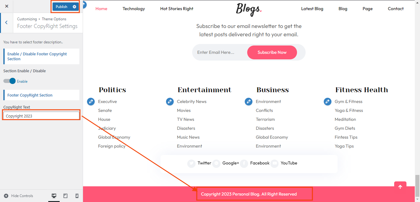 In order to proceed with footer Settings, You can also set footer logo , card image and card url. You can fill the copyright content to footer copyright Settings.