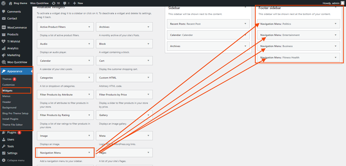 2. In the Dashboard, go to Appearance >> Widgets >> Footer Sidebar