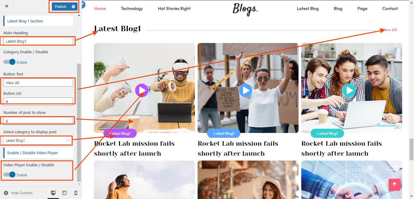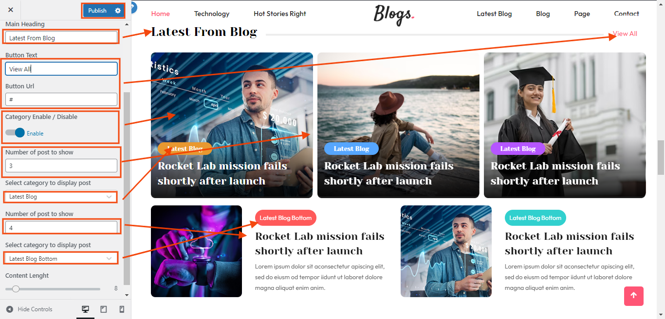 Select the number of posts to view. You have the choice of picking Category. You can choose from this options for each Latest Blog1 Settings.