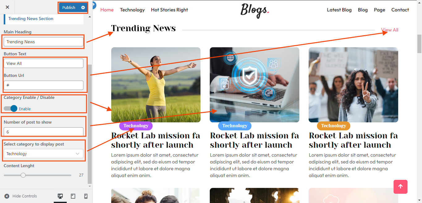 You can set heading and content of section. You can choose from this options in Trending News settings.