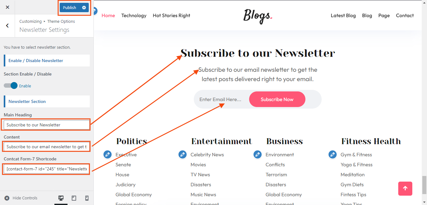 You can set heading and content for section. You can set the Contact Form Shortcode for each Newsletter settings
