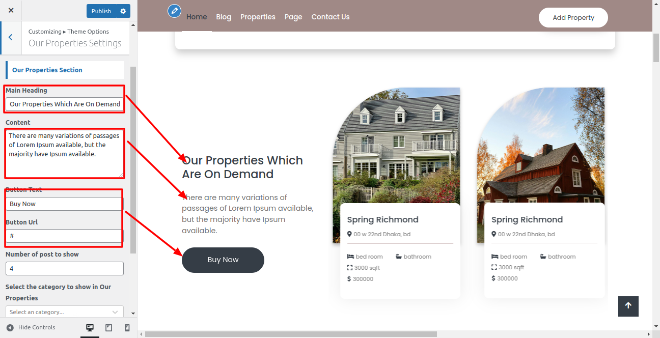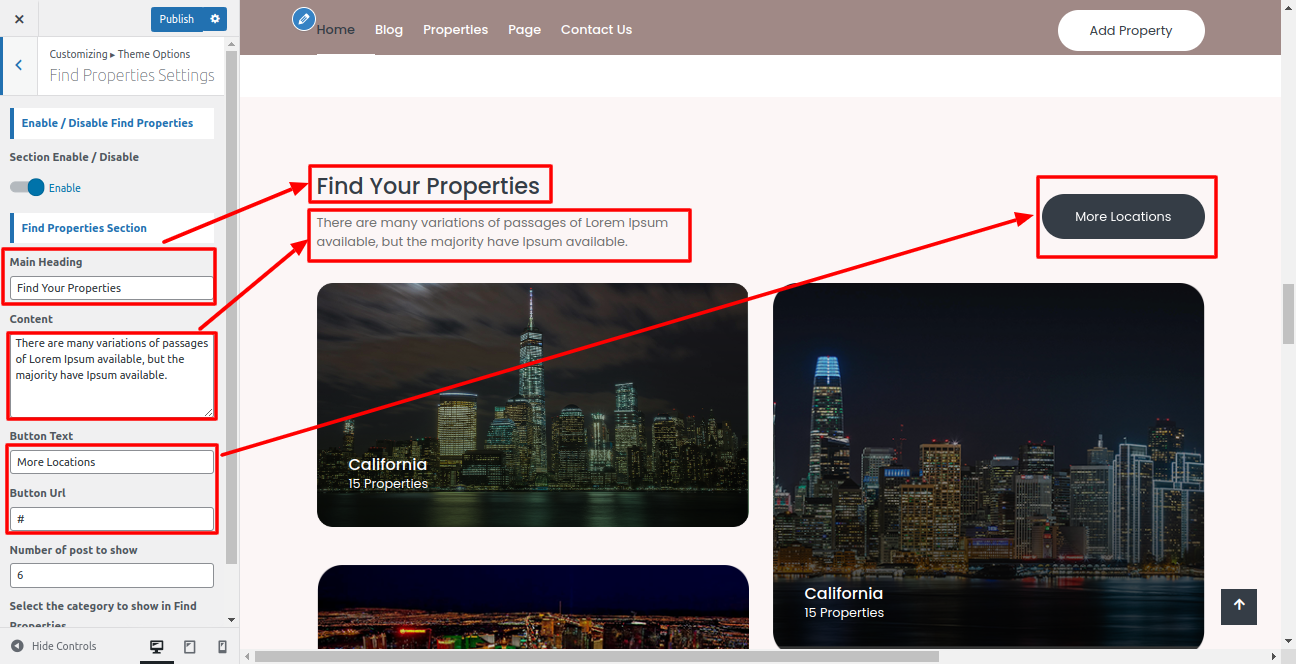 In the Dashboard, go to Appearance >> Customize >> Theme Options >> Our Properties Settings