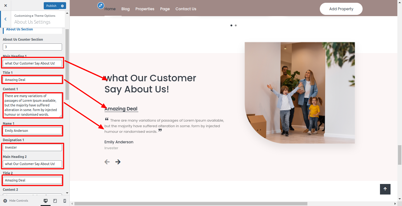 You can set the main heading for this section. Select the Agents counter of testimonial posts to view. For each Agents, you can set the images, name, and content. You have the following options to configure for each Agents setting