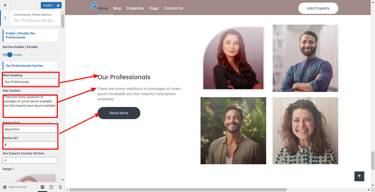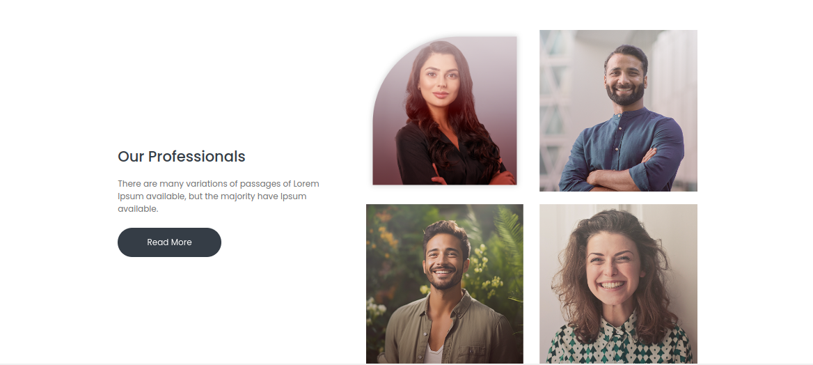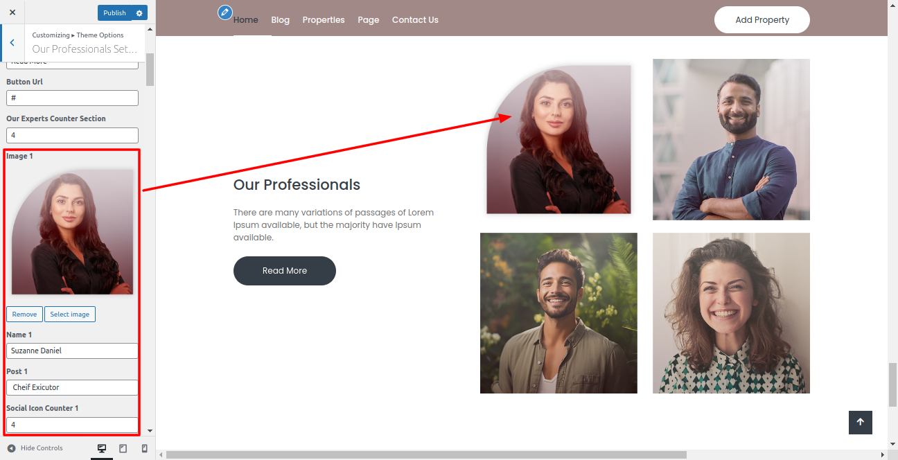 You can set Select the Our Professionals counter of images posts to view. For each Our Professionals, you can set the images and text. You have the following options to configure for each Our Professionals setting