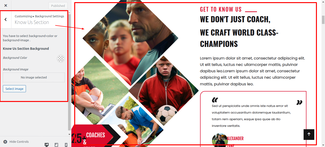 In the Dashboard, go to Appearance >> Customize >> Theme Options >> Know Us Settings