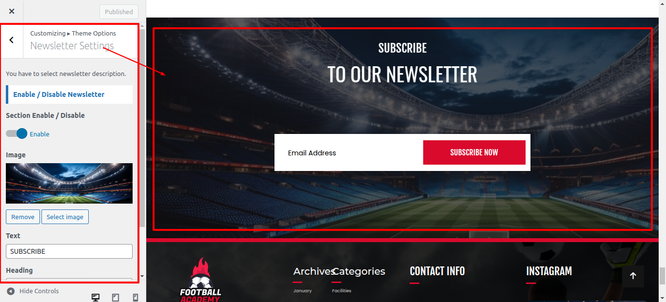 Than in the Dashboard, go to Appearance >> Customize >> Theme Options >> Newsletter Settings