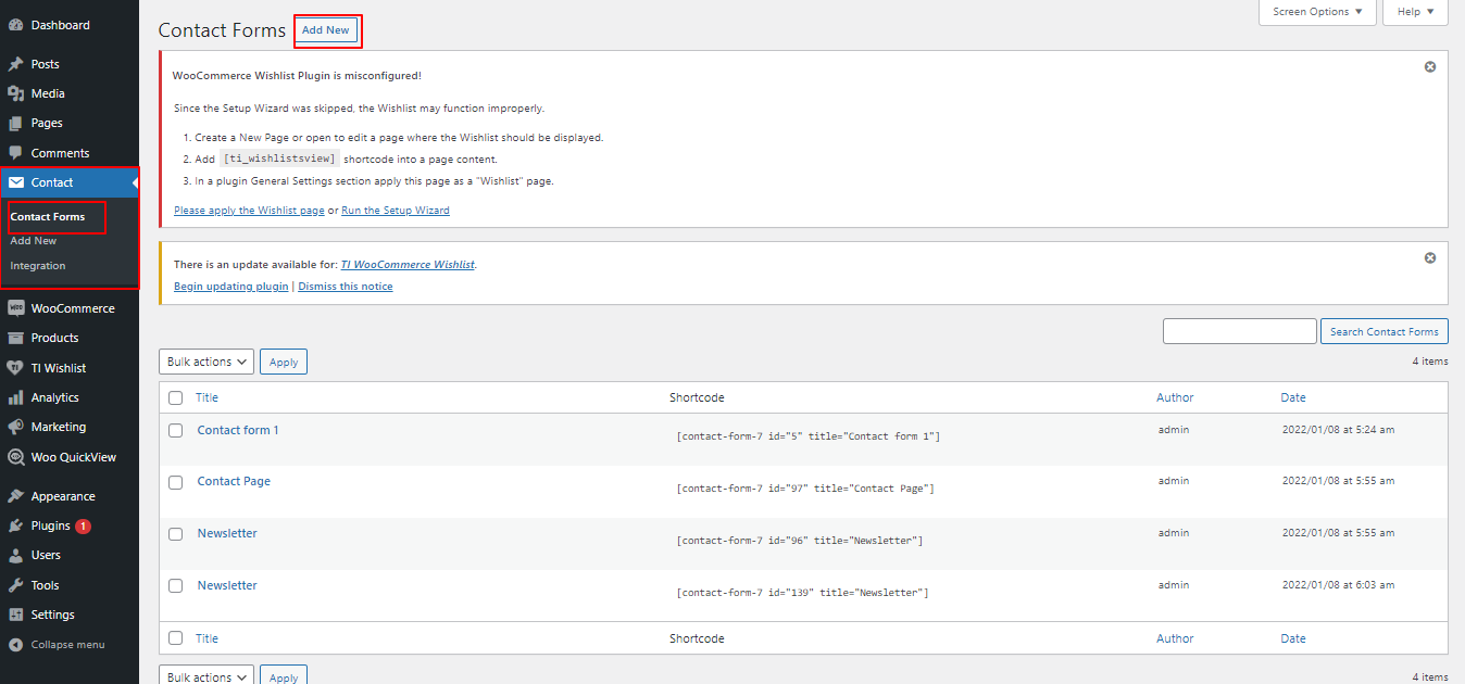 From the admin panel, just go to Contact > Contact Forms to create a Contact Form. There is a list of the forms that are available, though there are none, at now