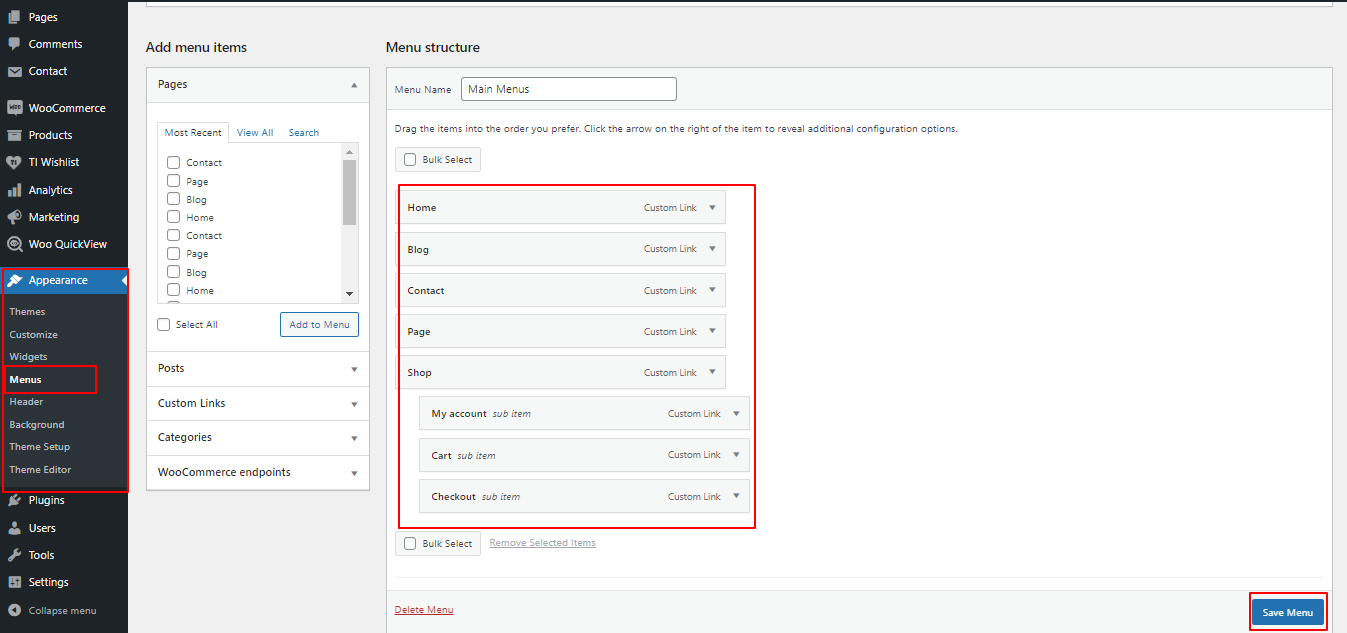 From the 'Appearance' menu on the left-hand side of the Dashboard, select the 'Menus' option to bring up the Menu Editor.