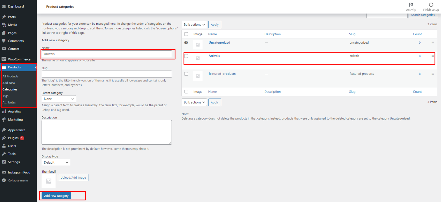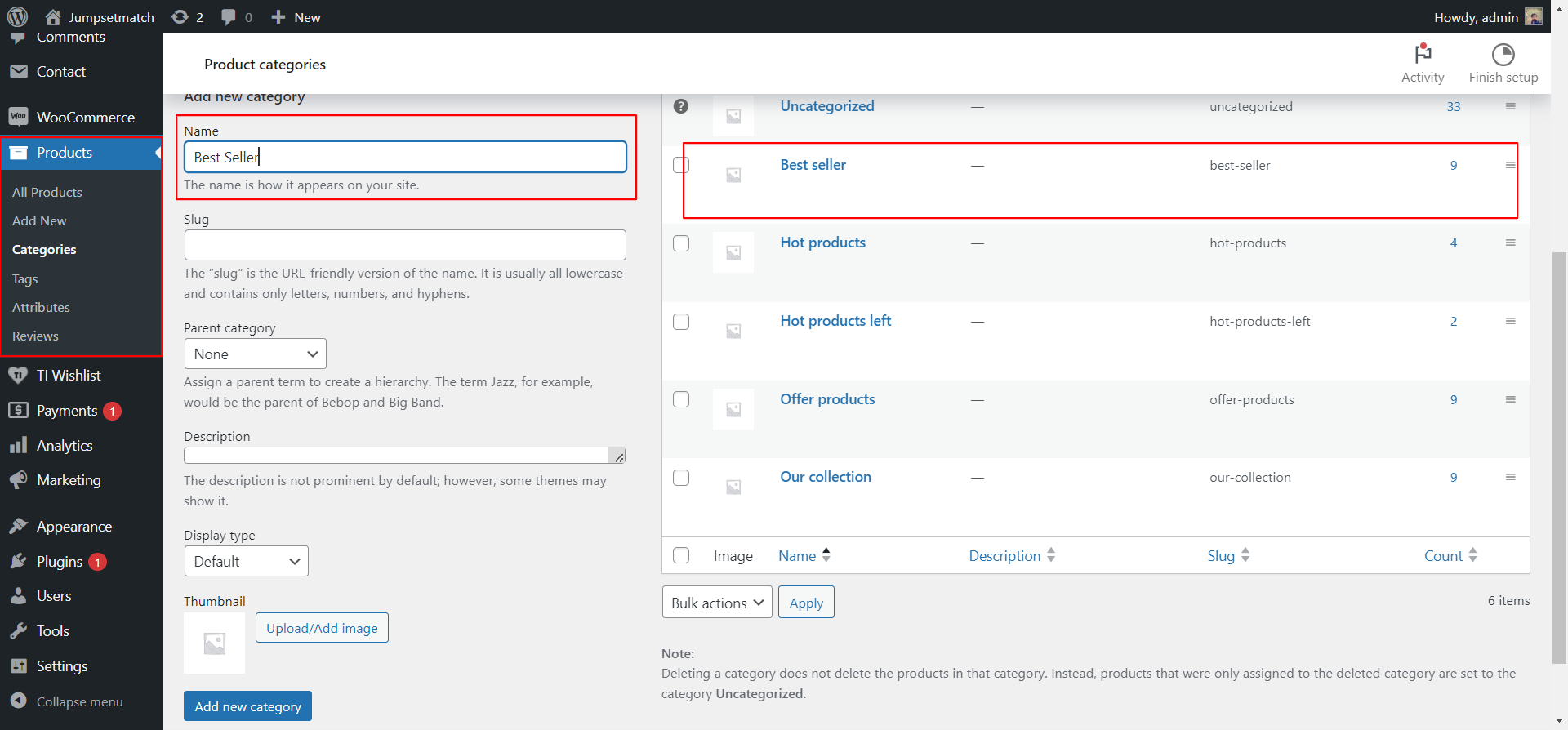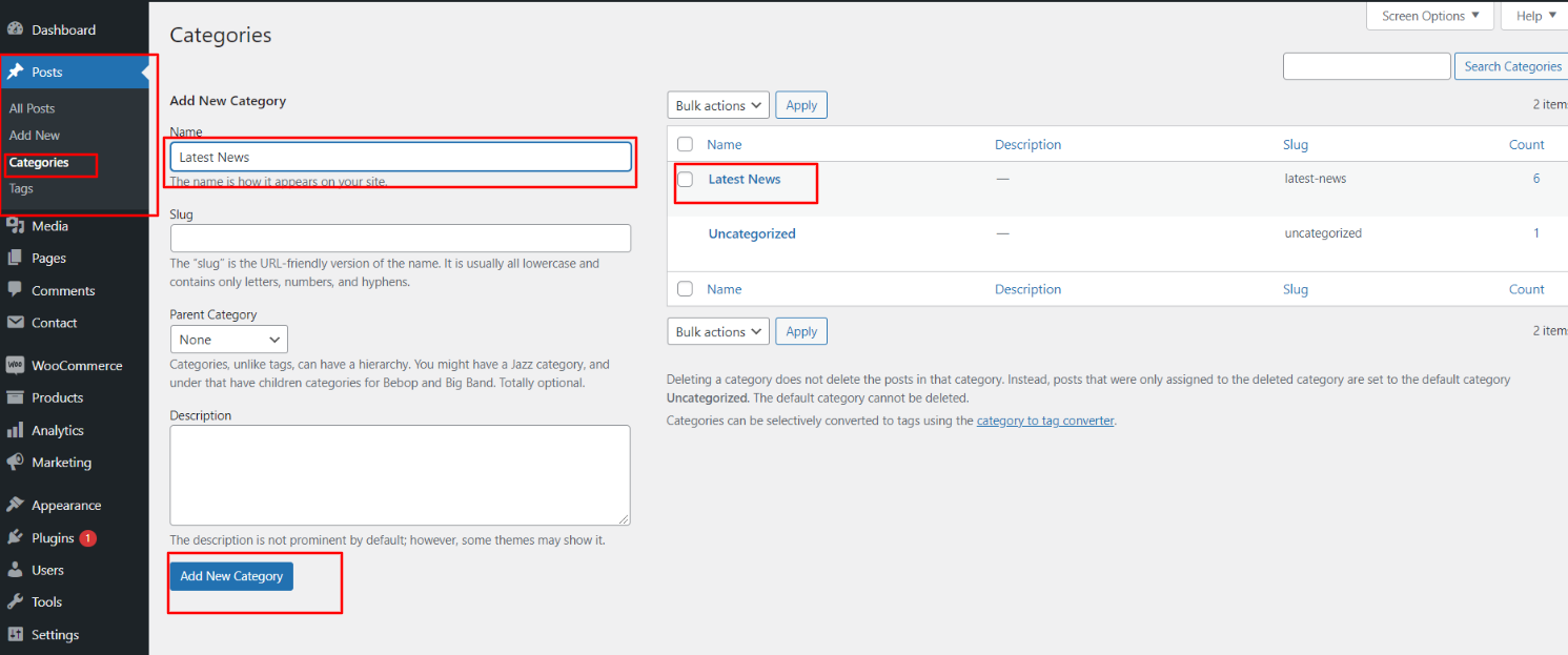 This screen is divided into 2 sections, the Add New Category and category table sections.