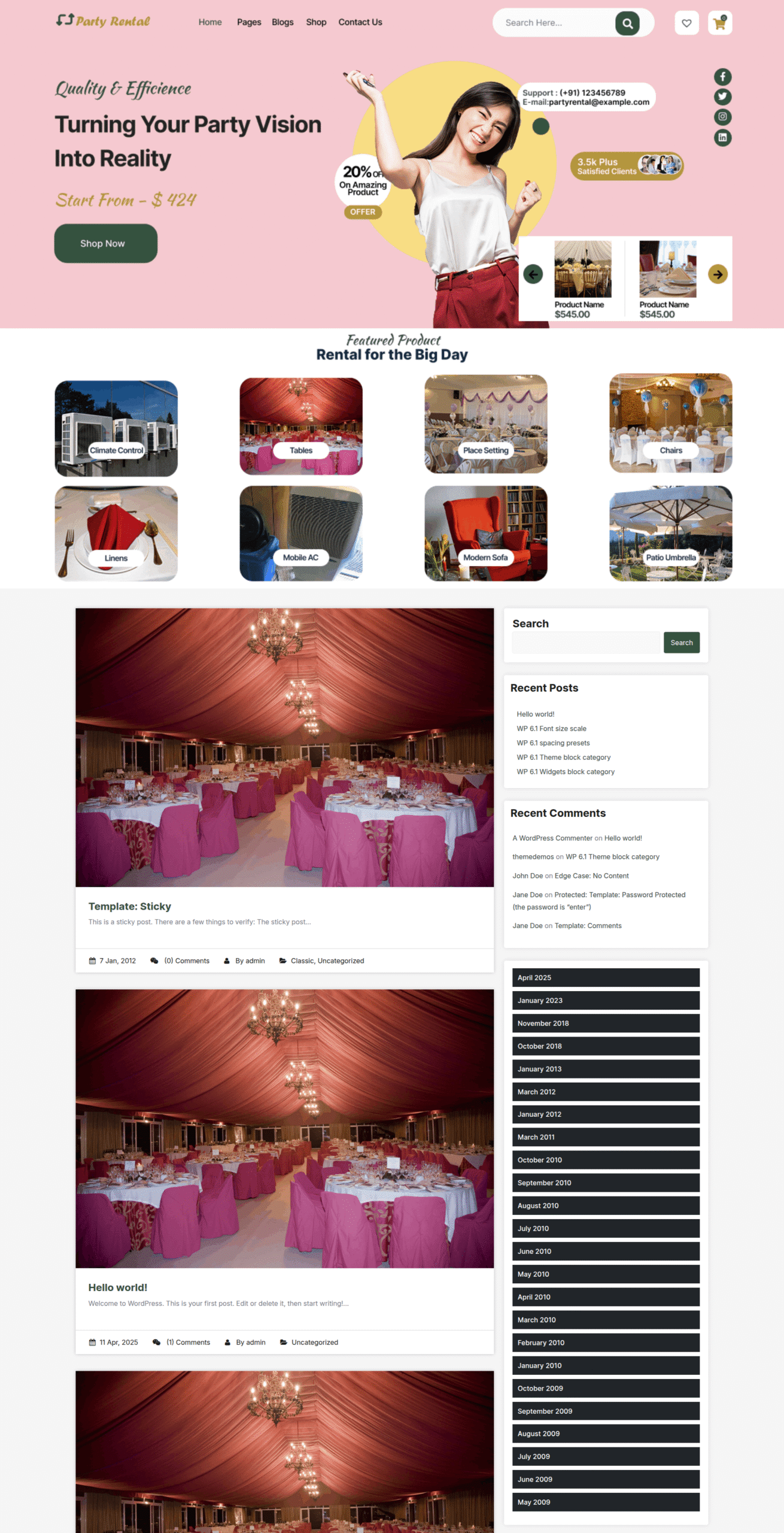 The Free Party Rental WordPress Theme is a dynamic and feature-rich solution designed for businesses in the event and party rental industry. Whether you’re offering party equipment rental, event decor rental, wedding rentals, or corporate event rentals, this theme provides the perfect platform to showcase your services and attract customers. It features an elegant, modern, and interactive layout with stunning visuals, making it easy for users to navigate through different categories such as table and chair rentals, tent rentals, lighting rental, and party furniture rental. Designed to be fully responsive and mobile-friendly, this theme ensures a seamless experience across devices, allowing visitors to browse offerings like photo booth rental, bounce house rental, DJ equipment rental, and catering equipment rental effortlessly. With SEO-friendly code and optimized performance, your website will rank higher in search results for queries like “party rentals near me” or “birthday party supplies,” driving more traffic and increasing conversions.